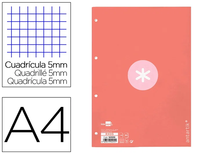 Recambio DIN A4 Antartik 80 hojas. Cuadro de 5 mm. 1 banda con 4 taladros. El recambio con exclusivo diseño, características de alta gama, un recambio sin precedentes que se distingue por la suavidad y blancura de su papel. Papel extrablanco de 90 g/m² ultrasuave que hace la escritura mucho más fluida. La tinta no traspasa.