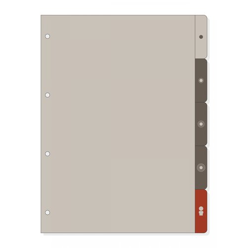 Juego de 5 separadores laterales en PVC para agendas de anillas Finocam Open (distancia entre taladros: 80-80-80). Apto para archivadores de 2 y 4 anillas. Medidas exteriores: 297 x 2 x 220 mm.