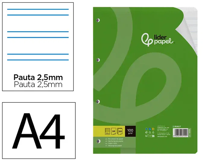 Liderpapel Recambio A4 100 Hojas 100gr Pauta 5ª 2.5mm Con Margen 4 Taladros
