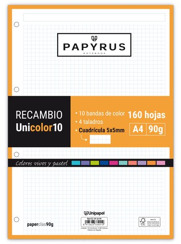 Recambio Papyrus Unicolor10 A4 160H 90G 4 Taladros Cuad.5X5 (Set de 15)