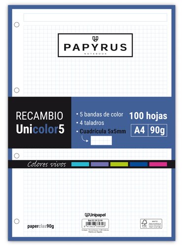 Recambio de 4 taladros con papel extra blanco de 90 gramos, rayado azul y 5 bandas de color, con certificado FSC®.
