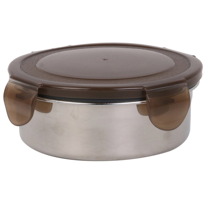 - Guarde y transporte las comidas en este recipiente de acero inoxidable con tapa de plástico.