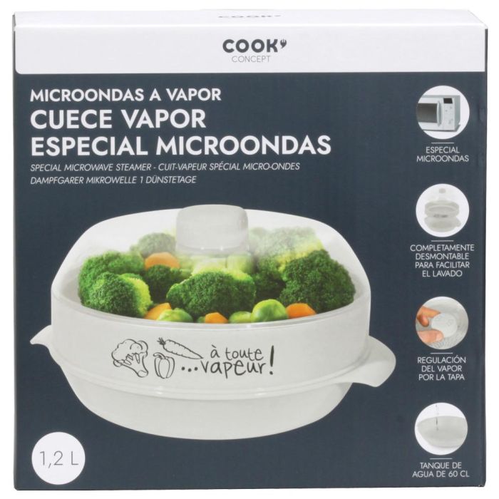 - Esta vaporera especial microondas es ideal para conservar la frescura y el crujiente de los alimentos. Este producto es completamente desmontable, cuenta con un depósito de agua y permite regular el vapor mediante la tapa.