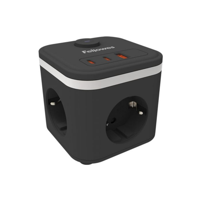 - Su forma cúbica reduce la acumulación de enchufes y deja más espacio para los dispositivos.