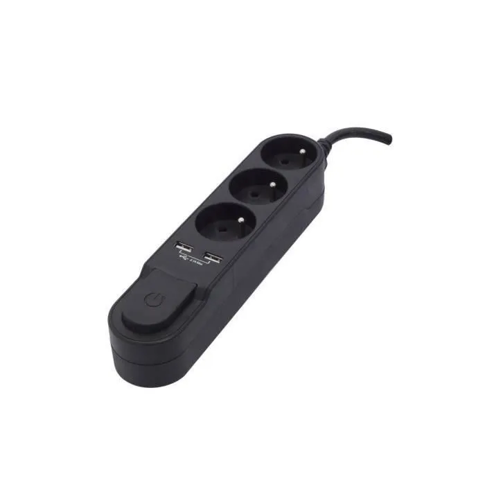 Regleta de alimentación negra - 3 enchufes - Cable de 1,5 m - Interruptor de pie - Máx. 2.1 A USB - Dos salidas USB de 2A - Ideal para recargar su iPhone, teléfono inteligente y tableta - Conecte sus diversos dispositivos eléctricos a una regleta con diseño elegante