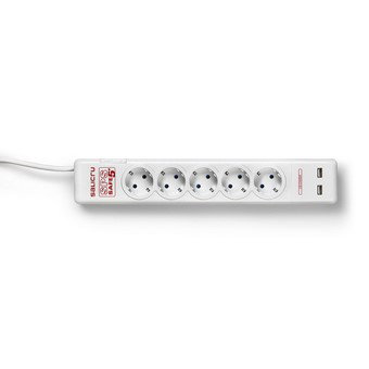Salicru SPS SAFE 5+ - Regleta Protector de Sobretensiones con 5 Tomas Schuko y 2 USB, Interruptor, Protección Rearmable, 1.8 m