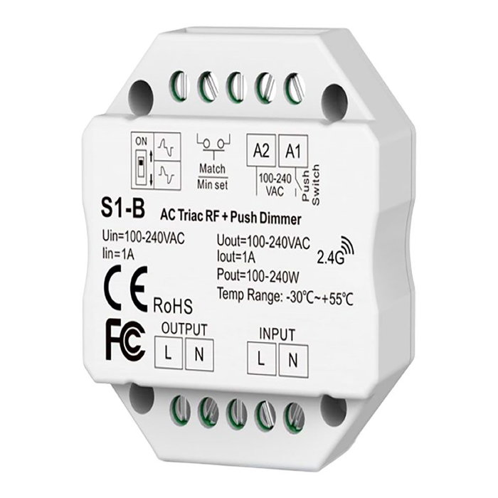 Regulador rf triac pastilla todo tipo de lámparas, 1,5 a, 100 - 360 w 100-240 v ø52 x 26 mm, es un regulador rf, principio o final de fase, ajuste de mínima luminosidad, con pulsador (opcional), instalación en caja universal - interruptor para cambio de regulación principio o final de fase, se puede utilizar con pulsadores, reguladores o mandos a distancia, 256 niveles de regulación, 30 m a mando rf 2,4 ghz, compatible con los controles remotos 30160, 30161