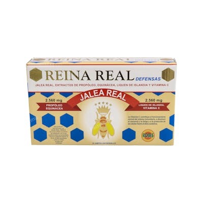 Composicion: Por 1 ampolla: Jalea real fresca ..... 500 mg. Propóleo ............... 1000 mg. Echinacea .............. 750 mg. Liquen de Islandia ... 250 mg. Vitamina C ............. 60 mg. Fructosa, sorbato y agua.