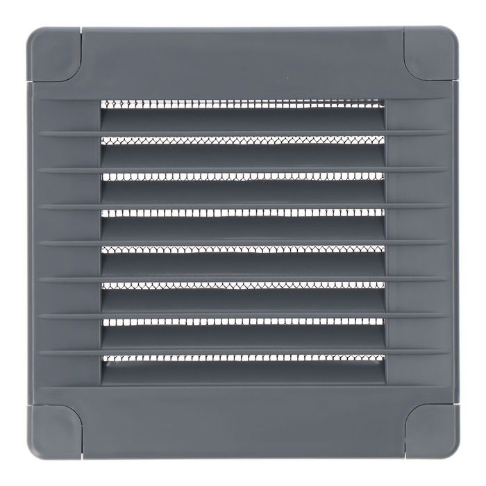 Rejilla ventilación cuadrada de plástico con tapones y mosquitera, medida100x100x7mm gris