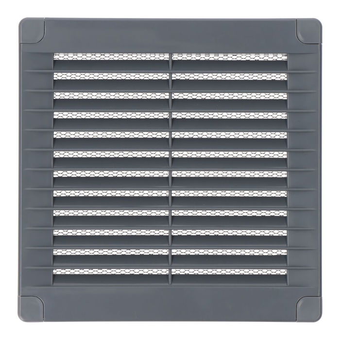 Rejilla ventilación cuadrada de plástico con tapones y mosquitera. medida:150x150x7mm.color gris