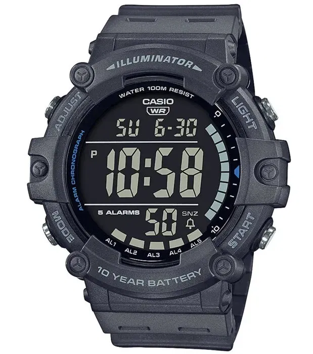 Iluminación LED. Cronómetro 1 / 100s - 24 horas. Cuenta regresiva - 1/1 seg - 24 horas. Calendario automático. Formato de hora de 12/24 horas. Estuche de resina. Pulsera de resina. Clase de estanqueidad (10 bares)