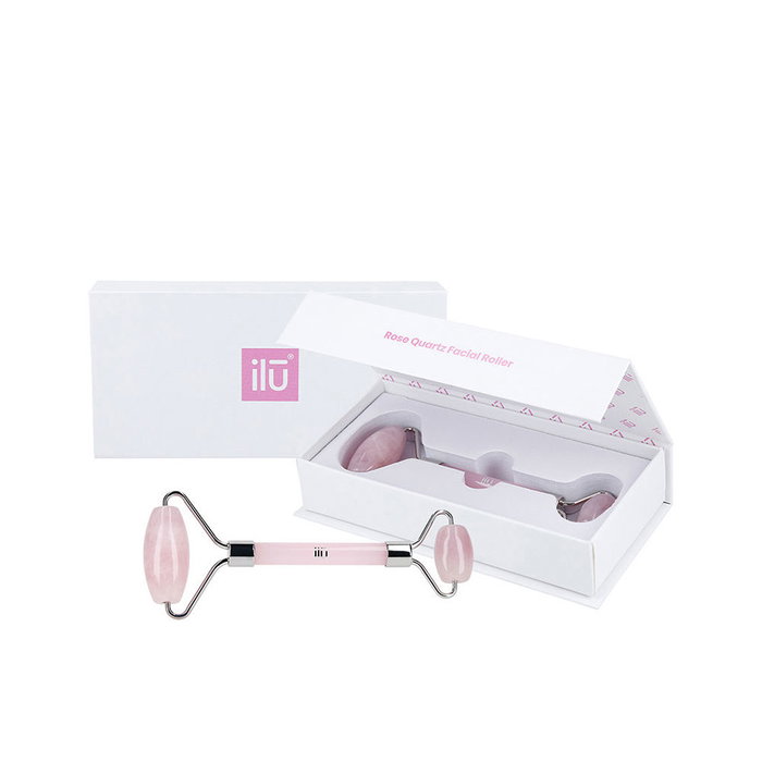 ILŪB - Facial Roller de Cuarzo Rosa 2 en 1 para Cara, Cuello y Escote - Rodillo de Masaje Estético para Drenaje Linfático y Antiarrugas - 1 unidad