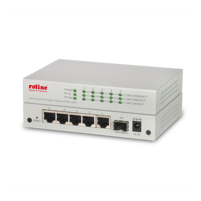 ROLINE 21.14.3523 Switch Ethernet Gigabit Gestionado WebSmart, 6 Puertos (5x RJ-45 10/100/1000 + 1x SFP), Montaje Pared, Metal Gris