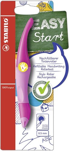 Primer rollerball con diseños específicos para diestros y zurdos. Zona de sujeción ergonómica fabricada con material antideslizante. La sujeción relajada previene la fatiga muscular mientras se escribe. Punta media de 0,5mm. La presentación incluye un Easyoriginal con dos recargas (azul borrable), más Mini colorkilla más etiqueta para el nombre.
