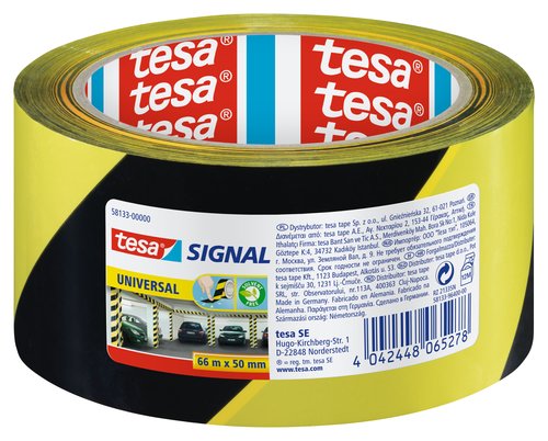 Cinta adhesiva de polipropileno para delimitar obstáculos permanentes y áreas peligrosas, con adhesivo sin disolventes y alta resistencia a los rayos ultravioleta.