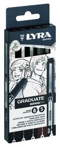 Los MangaPEN son rotuladores calibrados de alta calidad, con clip metálico. Su tinta es resistente al agua y al borrado. No se emborrona al combinarlo con rotuladores de base alcohol o de base agua. Son la herramienta ideal para realizar cualquier detalle gracias a las diferentes puntas: desde la más fina de 0,05 mm hasta la punta de 0,5 (el número del calibrado se indica en el cuerpo). Incluye un rotulador punta pincel media.