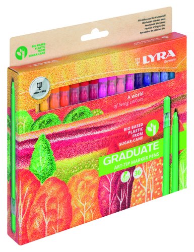 Lyra Graduate Art son rotuladores de base biológica: se fabrican con un 64 % de material de base biológica (cuerpo, capuchón y parte coloreada del capuchón), la materia prima utilizada proviene de plástico generado a partir de la caña de azúcar, un recurso renovable que contribuye a la reducción de las emisiones de gases, que fomentan el efecto invernadero. Son ideales para todas las técnicas de coloreado, lettering, bullet journal y manga. Su tinta de base agua, es inodora y soluble en agua. La punta, de fibra resistente, permite realizar trazos suaves.
