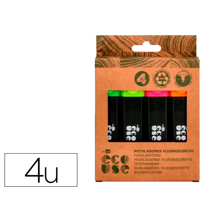 Liderpapel Rotulador Fluorescente Ecológico de Plástico Reciclado, Caja de 4 Unidades, Colores Surtidos