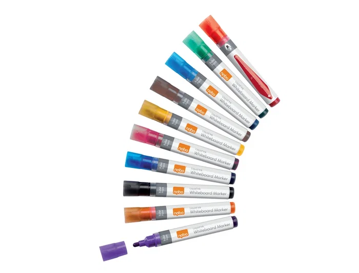 Rotuladores de tinta líquida Nobo con punta cónica, 10 unidades. Estos rotuladores no permanentes de uso diario para pizarras blancas son muy versátiles para su uso en superficies no porosas como pizarras blancas, cristal y acero vitrificado. Se secan rápidamente y se pueden eliminar fácilmente con un paño seco. Estos rotuladores de tinta líquida también tienen un práctico depósito con ventana que muestra los niveles de tinta para que nunca se agote en un momento crucial. Disponibles en varios colores para satisfacer todas tus necesidades de presentación, son ideales para escuelas, oficinas y el hogar. Paquete de 10 rotuladores de borrado en seco con punta cónica de 3 mm para obtener líneas uniformes. Utilízalos con una pizarra bl blanca Nobo para obtener un rendimiento óptimo.