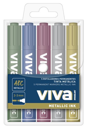 Rotuladores permanentes de tinta con base agua, en colores metálicos, punta cónica y trazo 2-3 mm. Un marcador para rotular casi todo tipo de superficies.