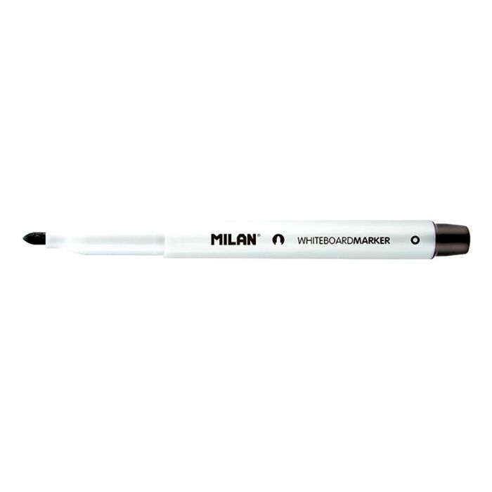 Caja de 12 rotuladores negros para pizarra blanca milan. rotuladores para pizarra blanca, color negro. borrable en seco. tinta a base de alcohol. punta redonda ø3,7mm. recomendamos tapar después de usar y almacenar en posición horizontal. rotuladores de recambio para el borrador magnético ref: 16589122