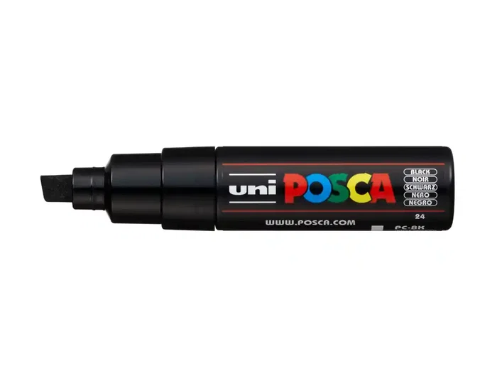 Marcador de pintura no permanente, base agua. No es tóxico Punta biselada acrílica PC8K de 8,0 mm Pinta sobre cualquier superficie: metal , vidrio, plástico, piedra, tela, terracota, porcelana y muchos más Color opaco: dejar secar después de la aplicación y la nueva cap de pintura, cubrirá completamente el color anteiror. Negro