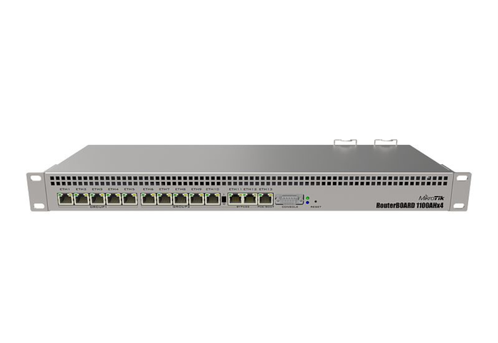 Mikrotik RB1100AHx4. Tipo de interfaz ethernet: Gigabit Ethernet, Tecnología de cableado: 10/100/1000Base-T(X), Ethernet LAN, velocidad de transferencia de datos: 10,100,1000 Mbit/s. Modelo del procesador: Annapurna Labs Alpine AL21400, Frecuencia del procesador: 1400 MHz, Unidad de almacenamiento: Flash. Color del producto: Acero inoxidable, Capacidad del rack: 1U, Indicadores LED: Actividad, Fallo. Consumo energético: 20 W, Alimentación: Corriente alterna, CC, PoE, Voltaje de entrada AC: 100 - 240 V. Ancho: 444 mm, Profundidad: 148 mm, Altura: 47 mm