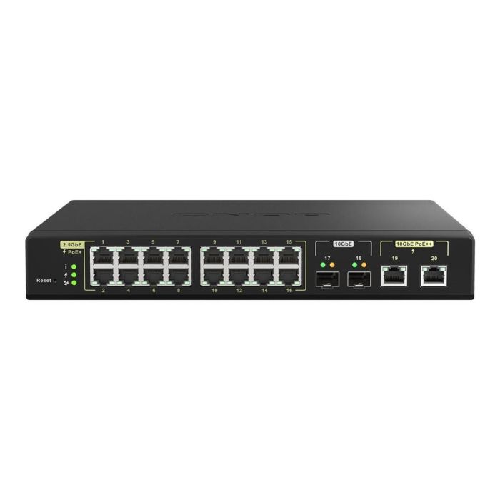 El QNAP QSW-M2116P-2T2S es un conmutador gestionado de alto rendimiento diseñado para entornos profesionales que requieren conectividad multigigabit, alimentación PoE++ y una gestión centralizada sencilla. Con 20 puertos gestionados, soporte para velocidades de hasta 10 GbE y una capacidad PoE de hasta 280 W, este switch es ideal para instalaciones de vigilancia, redes empresariales modernas y despliegues IoT intensivos.