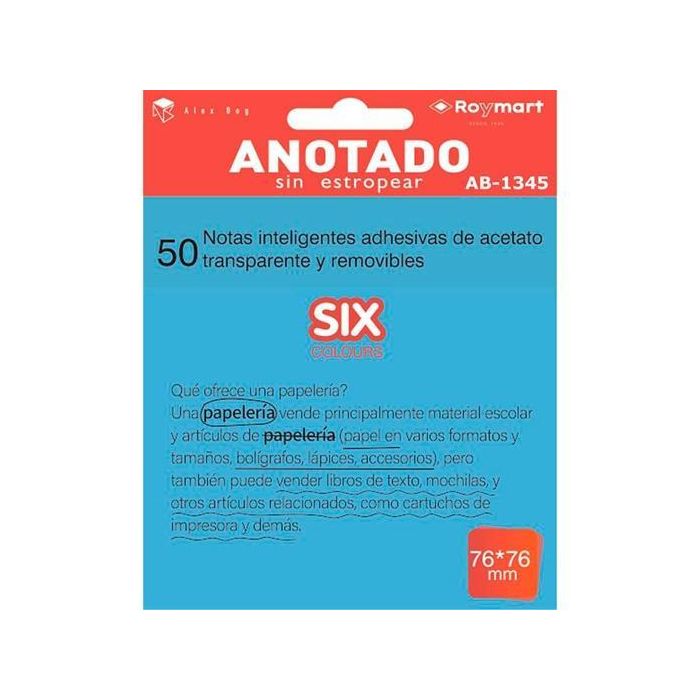 Roymart Bloc Notas Adhesivas Inteligentes Removibles 50H 76x76mm Acetato Transparente Azul Flúor