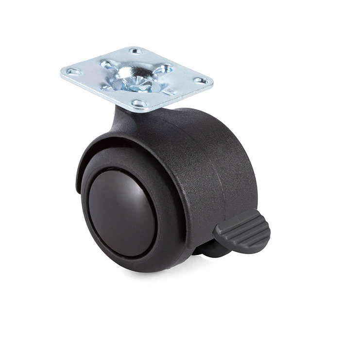 La rueda giratoria modelo Onixa de Q&Q, con aro de goma y diámetro de 50mm, viene con placa y freno para facilitar el movimiento de muebles y protegerlos del suelo.