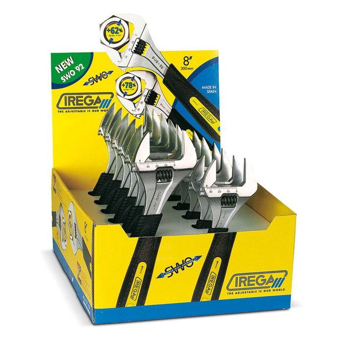 Expositor de 12 llaves ajustables de gran apertura de 6 y 8 pulgadas, contiene: 6 unid. swo 6 pulg (apertura 34 mm) 6 unid. swo 8 pulg (apertura 39 mm) made in spain
