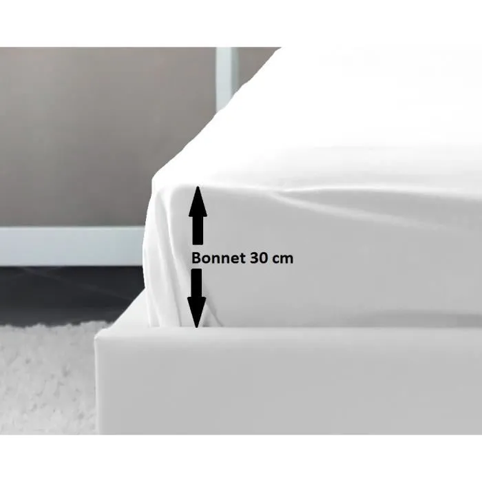Sábana ajustable en algodón 100% tejido de 54 hilos de color blanco. Con sombrero de 30 cm. Para cama de matrimonio. Lavable a máquina a 40 ° C. Certificado OeKO-TEX. Dimensiones: 180x200 cm.