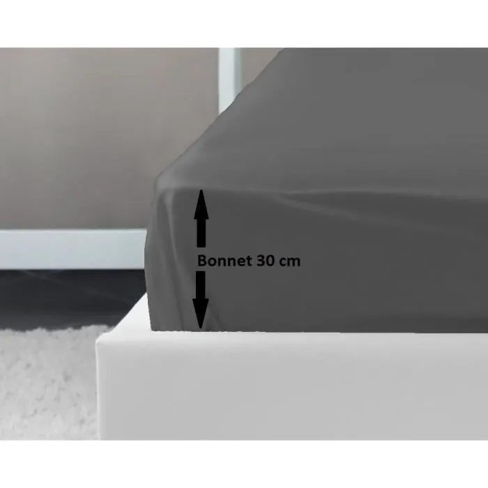 Sábana ajustable en algodón 100% muy tejido 54 hilos de color gris oscuro. Con sombrero de 30 cm. Para cama de matrimonio. Lavable a máquina a 40 ° C. Certificado OeKO-TEX. Dimensiones: 180x200 cm.