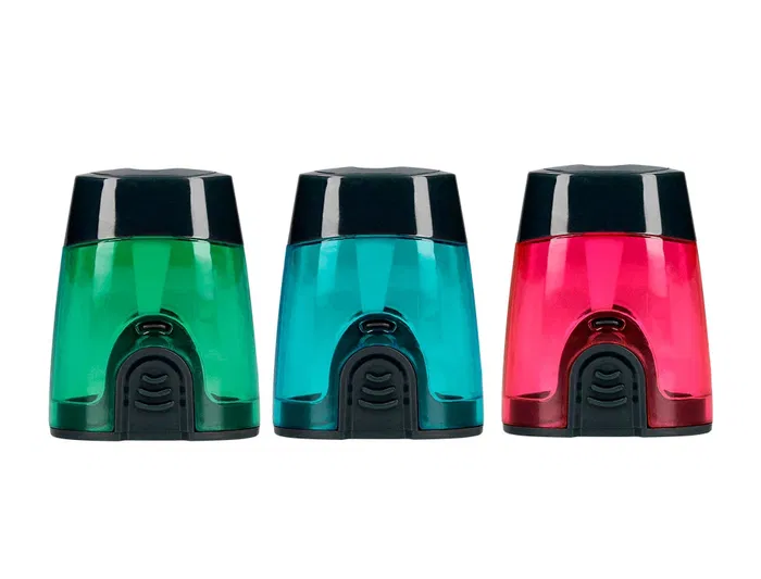 Cuerpo de plástico y sacapuntas metálico. Alta seguridad para niños: con protector de la cuchilla para evitar cortes en los dedos al limpiar el sacapuntas. Colores surtidos. Un uso.