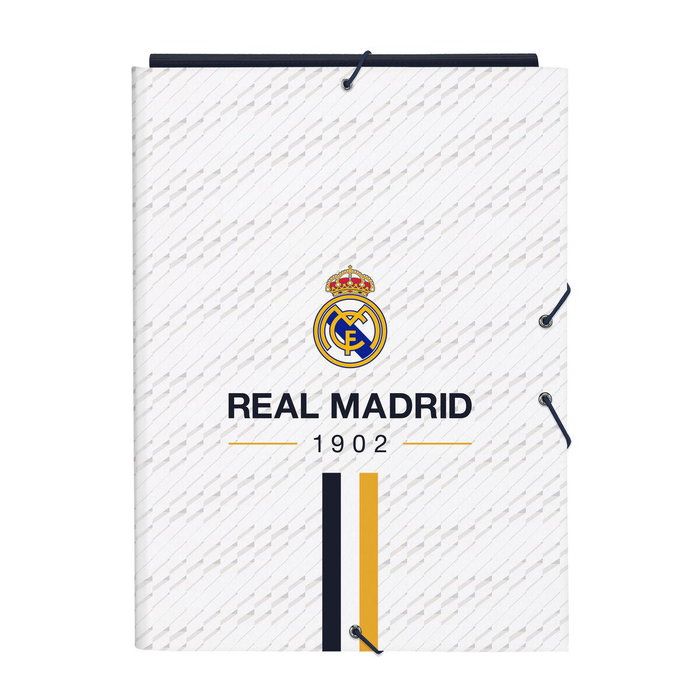 Safta REAL MADRID 1ª EQUIP. 23/24 recomendada para FÚTBOL-BASKET. 2 años de garantía. Tapas duras forradas. Tamaño folio. Cierre con gomas elásticas. Con 3 solapas interiores. 260x25x335 mm L.