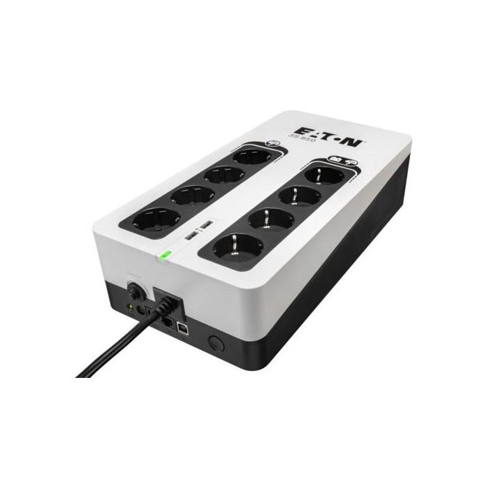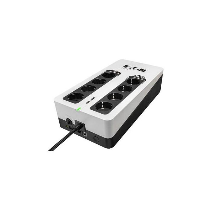 Eaton 3S850D. Topología UPS: En espera (Fuera de línea) o Standby (Offline), Capacidad de potencia de salida (VA): 0,85 kVA, Potencia de salida: 510 W. Cantidad de salidas AC: 8 salidas AC. Tecnología de batería: Sealed Lead Acid (VRLA). Color del producto: Negro, Blanco, Longitud de cable: 1,5 m, Seguridad: IEC 62040-1; IEC 62040-2 C2; IEC 62040-3; IEC 62040-4; IEC 61643-11. Ancho: 335 mm, Profundidad: 170 mm, Altura: 86 mm