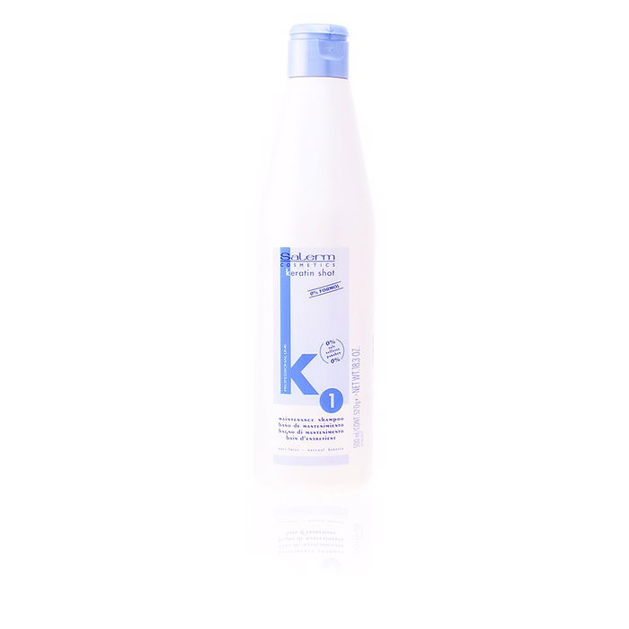 Descubre el poder del KERATIN SHOT maintenance shampoo de Salerm. Este champú formulado para nutrir y fortalecer tu cabello, eliminando el encrespamiento de manera efectiva. Es un tratamiento rehidratante que ofrece un efecto lifting, prepara tu melena para el sistema de alisado y asegura un mantenimiento óptimo después del mismo.