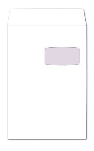 Sobre bolsa DIN C4 en papel Offset blanco de 100 gramos, con tira de silicona y ventana derecha de 50 x 110.