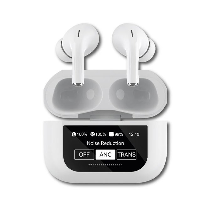 Auriculares inalámbricos Sami ULTRA PRO TWS en color blanco. Este modelo premium cuenta con tecnología de cancelación activa de ruido (ANC) para una experiencia de audio inmersiva y libre de distracciones. Además, incorpora una práctica pantalla LC (pantalla de cristal líquido) que permite visualizar información relevante como el estado de la batería o la conexión. Diseño ergonómico y compacto para un uso cómodo durante todo el día. Marca: SAMI.