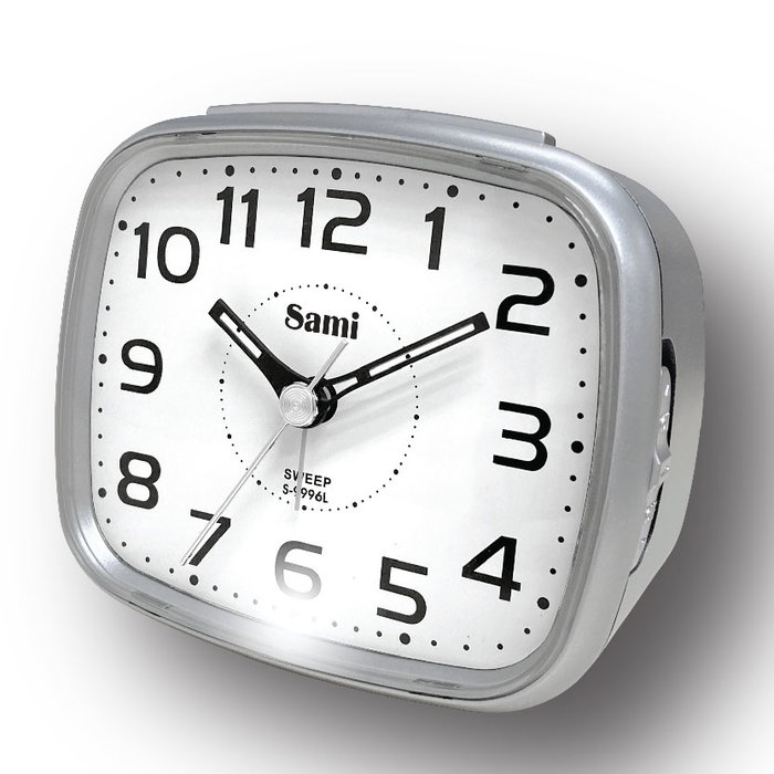 Despertador SAMI de esfera blanca con números en luz superior LED en color plata. Su diseño claro y luminoso facilita la lectura de la hora, incluso en la oscuridad, gracias a su pantalla retroiluminada. Ideal para mantener un horario regular y despertarse con facilidad cada mañana.
