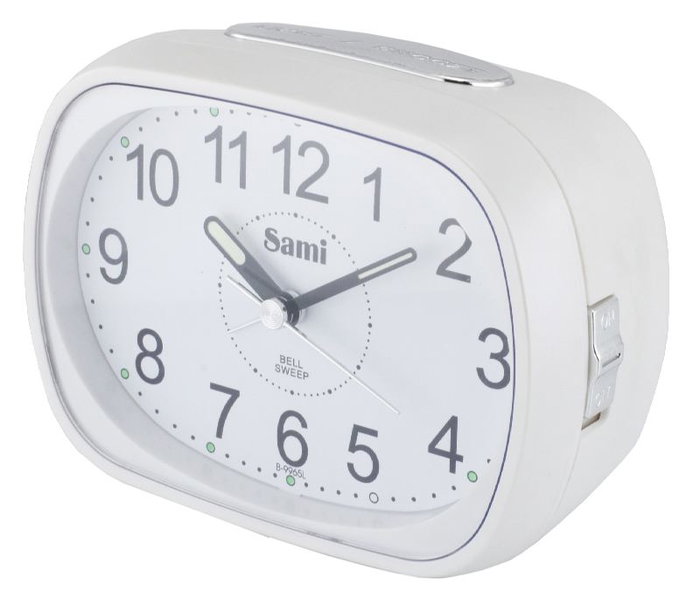 Despertador de la marca SAMI de tamaño mediano con diseño ovalado. Incluye pantalla LED para una lectura clara de la hora y funciona con un mecanismo silencioso de campana. Este modelo está disponible en color azul, ideal para proporcionar un despertar suave y gradual sin ruidos molestos.
