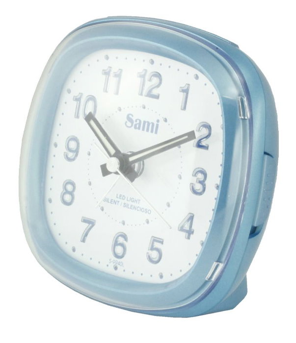 Despertador Sami con formato mediano y diseño cuadrado, en color azul. Funciona de manera silenciosa, asegurando un despertar sin ruidos molestos. Incluye luz de fondo en tono azul para facilitar la visualización de la hora en la oscuridad. Ideal para dormitorios u oficinas donde se requiere un ambiente tranquilo. Fabricado por la marca SAMI, reconocida por sus productos prácticos y funcionales.