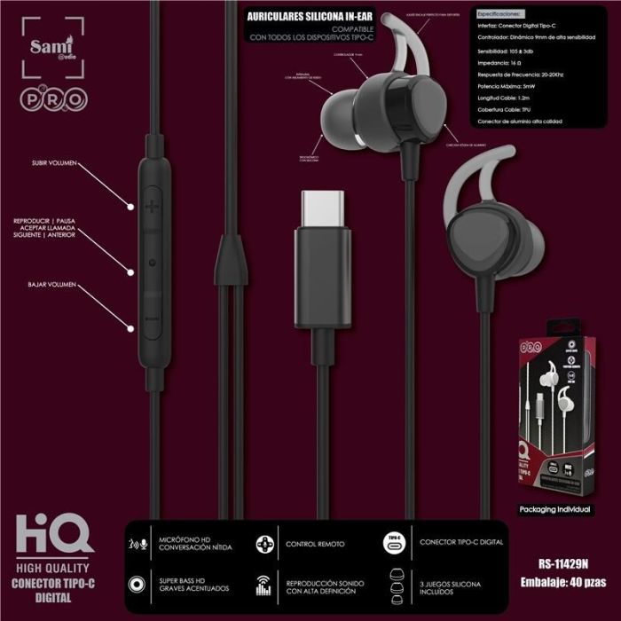 Auriculares Sami Pro de color negro con conector digital Tipo C. Un accesorio esencial para disfrutar de una experiencia de audio superior, perfecto para uso con dispositivos modernos que cuentan con este puerto.