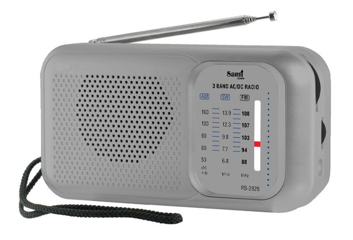 Radio SAMI AC/DC, una solución versátil para tu música. Funciona con pilas y corriente eléctrica, ideal para uso en casa y exterior. Equipada con 3 bandas de sintonización, incluye correa de transporte y su diseño compacto en color gris metalizado facilita llevarla a cualquier parte.