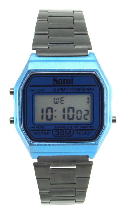 Reloj de pulsera SAMI de estilo retro con pantalla LCD en color azul. El modelo es IPBLUE / CORR NEG IPB W. Diseño clásico con tecnología moderna para un look único y funcional.