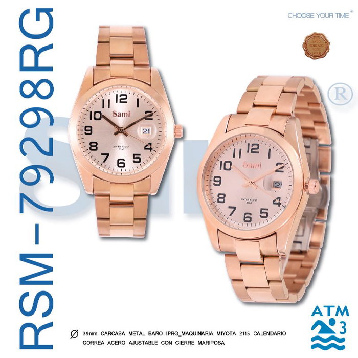 Reloj Sami unisex de acero con correa metálica y función de fecha. Este modelo presenta una resistencia al agua de 3ATM, ideal para uso diario y resistente a salpicaduras o lluvia. Fabricado por la marca SAMI, es un accesorio funcional y elegante para cualquier ocasión.