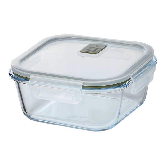 Fiambrera hermética de vidrio de borosilicato cuadrada, serie experto, tapa de pp transparente y silicona de color verde oliva (pq-7764c), con 4 cierres y válvula de descompresión, apilable, apta para congelador, frigorífico y lavavajillas, apta sin la tapa para microondas y horno, 800 ml, 15,9 x 15,9 x 7 cm