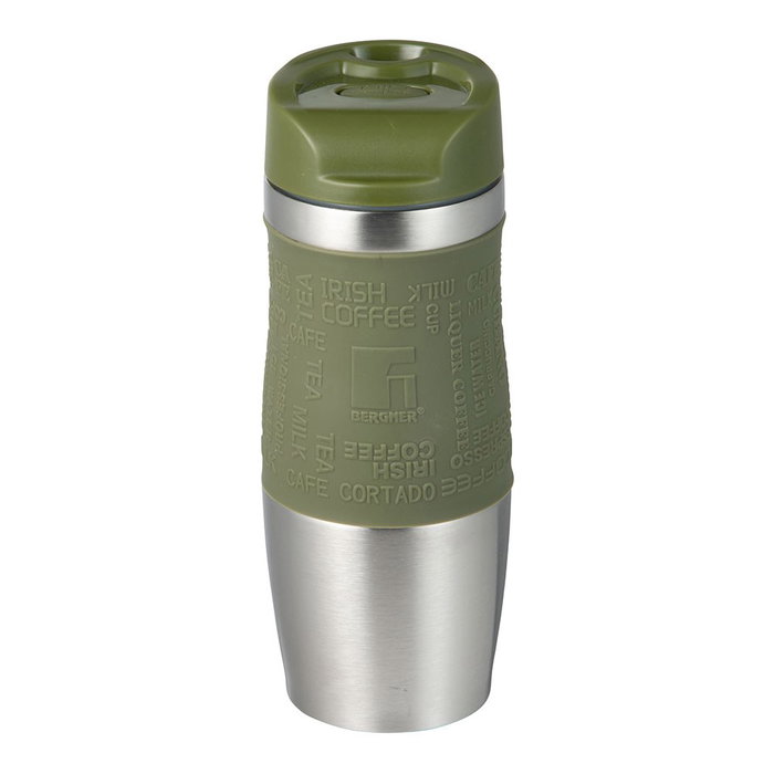 Vaso de viaje, serie experto, de acero inoxidable con funda de silicona verde oliva, de doble pared, con tapa de pp y base de goma antideslizante, sistema de apertura por pulsación a una sola mano, 360 ml, ø8,3 x 21,2 cm, presentado en expositor de 8 uds