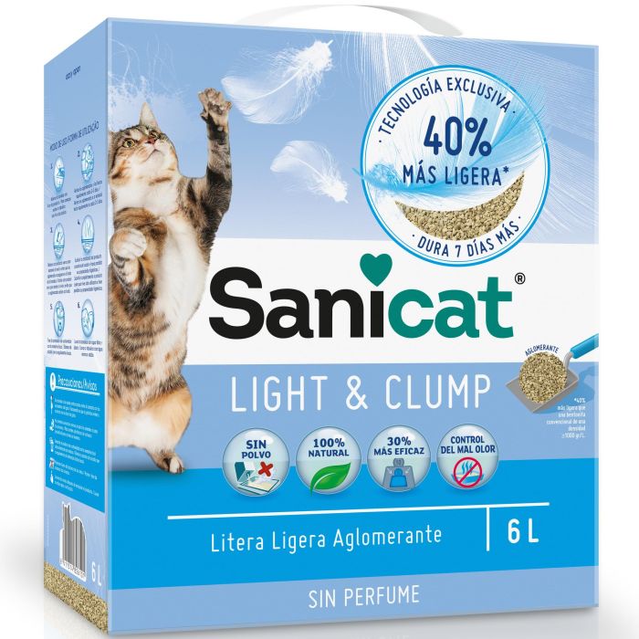 La arena aglomerante Light & Clump de Sanicat dura 7 días más que las bentonitas convencionales y es un 40 % más ligera. Se compone de una arcilla 100 % natural y no contiene polvo por lo que gusta tanto a los gatos como a sus dueños.