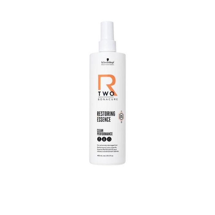 Una Esencia Restauradora instantánea de Bonacure R-TWO que prepara, restaura y fortalece el cabello antes de los servicios de decoloración, aclaración y coloración, así como durante los servicios de cuidado, cuando se utiliza en combinación con el Tratamiento Reparador o el Sellador Renovador.